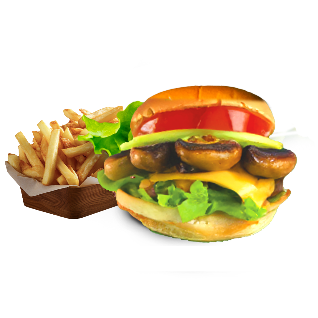 BUN MARTINS, AVOCAT, CHAMPIGNONS FRAIS GRILLÉ, CHEDDAR, OIGNONS, SALADE, TOMATE, CORNICHONS, SAUCE SMASH.